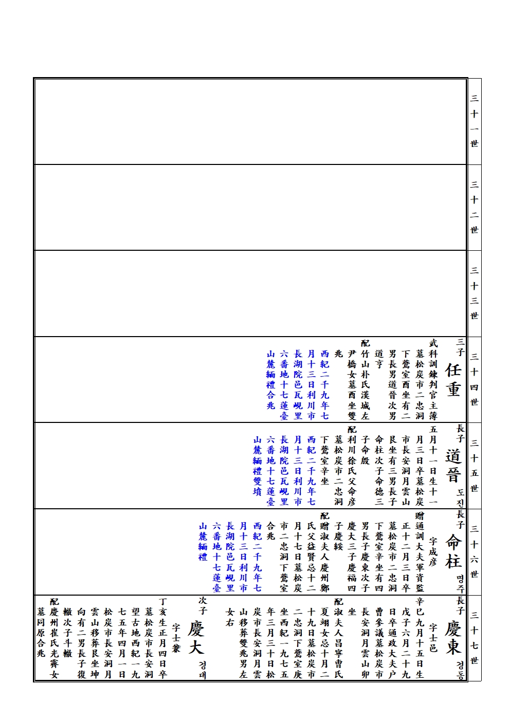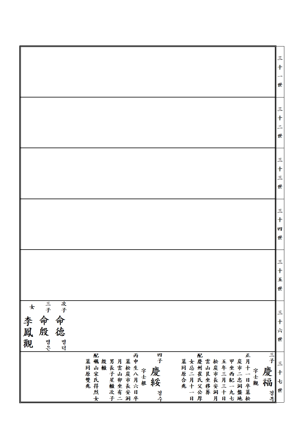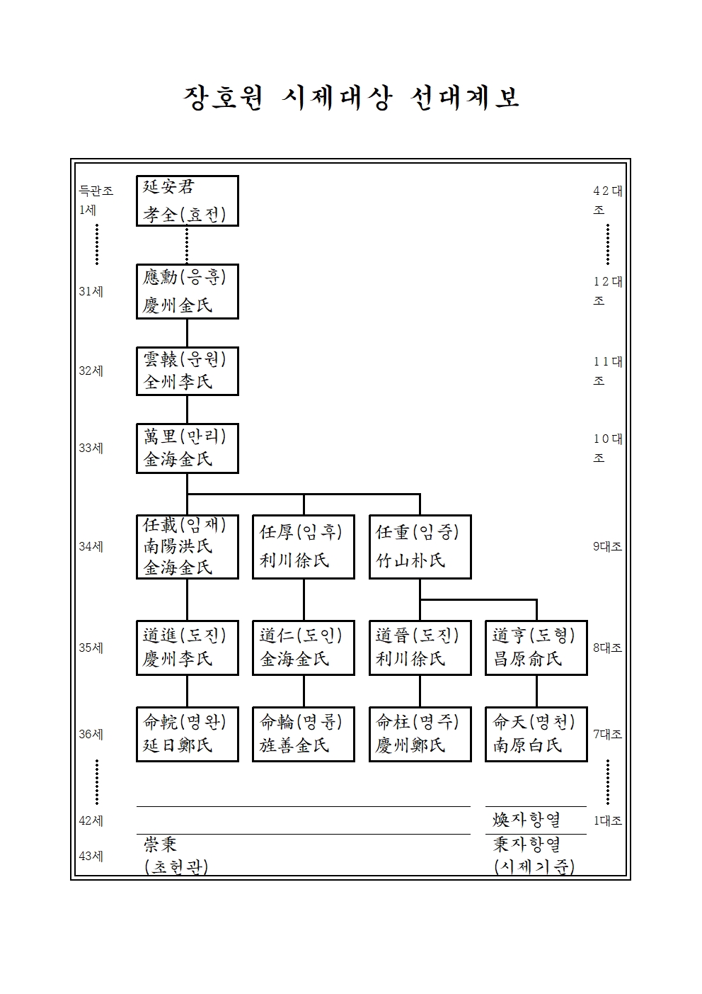 31세 함열공(諱 應勳) 부터 37세 慶자 항열까지의 계보 입니다. 계보는 1990년 편찬한 문절공파 함열공계보내용을 그대로 수록한 사항이며, 변동 사항은 없습니다. 다만, 함열공을 포함하여 36세 命자 항열( 行列 )까지 2009년 묘소를 燕室(제비실)에서 이천시 장호원읍 와현리로 면례하였으며, 매년 양력 11월 첫주 토요시향을 모시고있습니다. 이후 37세 慶자 항열 선조님 부터는 소종중을 이루어 별도의 시향을 모시고 있습니다. 아래는 와현리선영 시향 대상 시조님 계보와 31세부터 37세 慶자 항열(소종중) 까지 계보입니다.