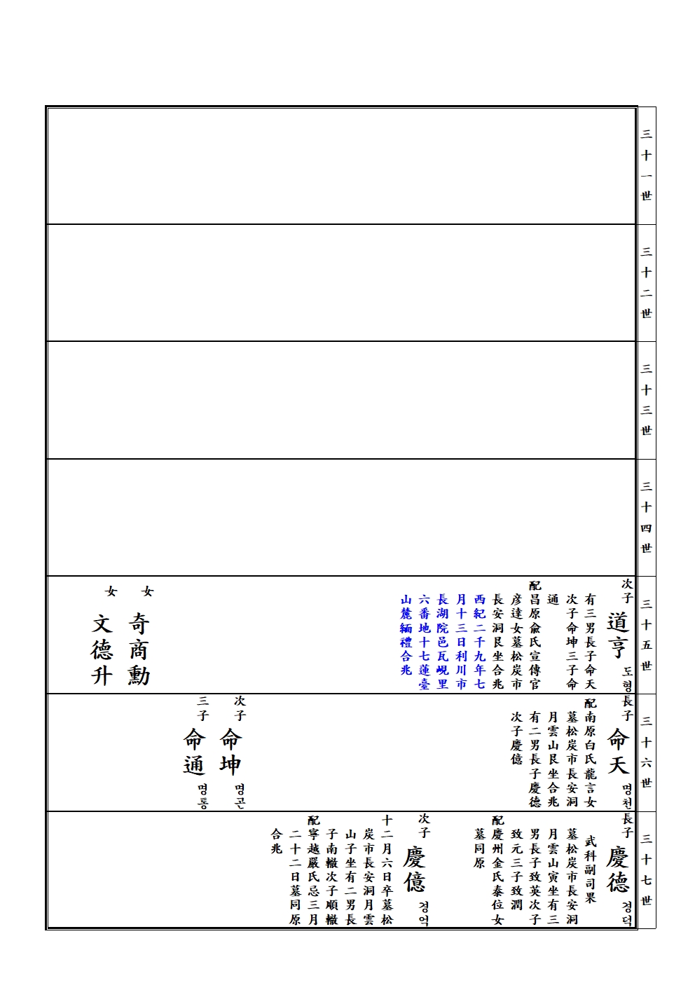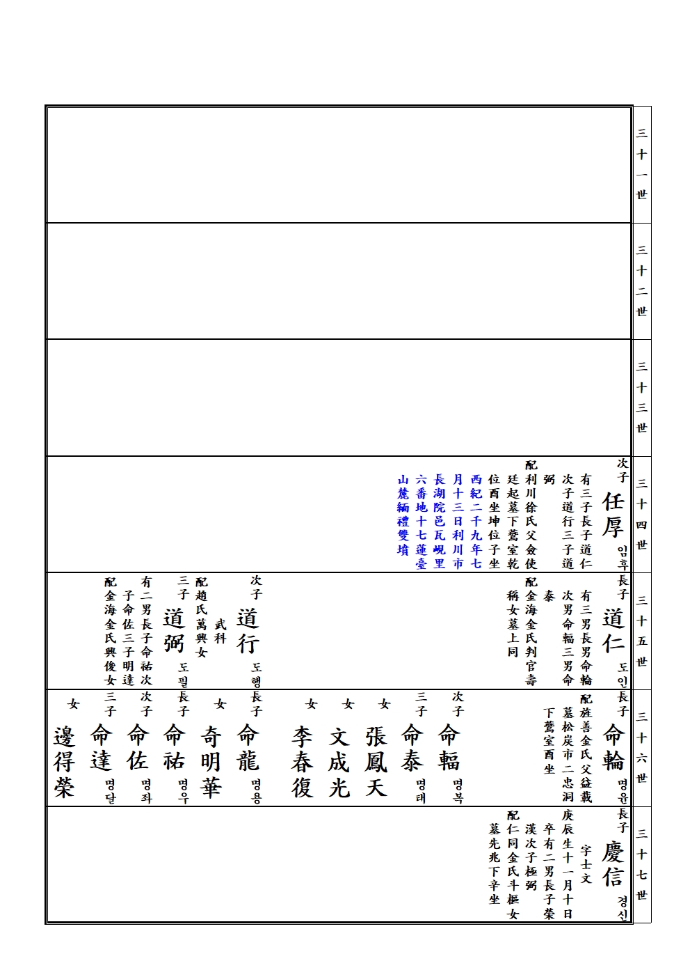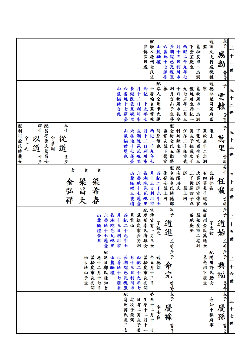 31세 함열공(諱 應勳) 부터 37세 慶자 항열까지의 계보 입니다. 계보는 1990년 편찬한 문절공파 함열공계보내용을 그대로 수록한 사항이며, 변동 사항은 없습니다. 다만, 함열공을 포함하여 36세 命자 항열( 行列 )까지 2009년 묘소를 燕室(제비실)에서 이천시 장호원읍 와현리로 면례하였으며, 매년 양력 11월 첫주 토요시향을 모시고있습니다. 이후 37세 慶자 항열 선조님 부터는 소종중을 이루어 별도의 시향을 모시고 있습니다. 아래는 와현리선영 시향 대상 시조님 계보와 31세부터 37세 慶자 항열(소종중) 까지 계보입니다.